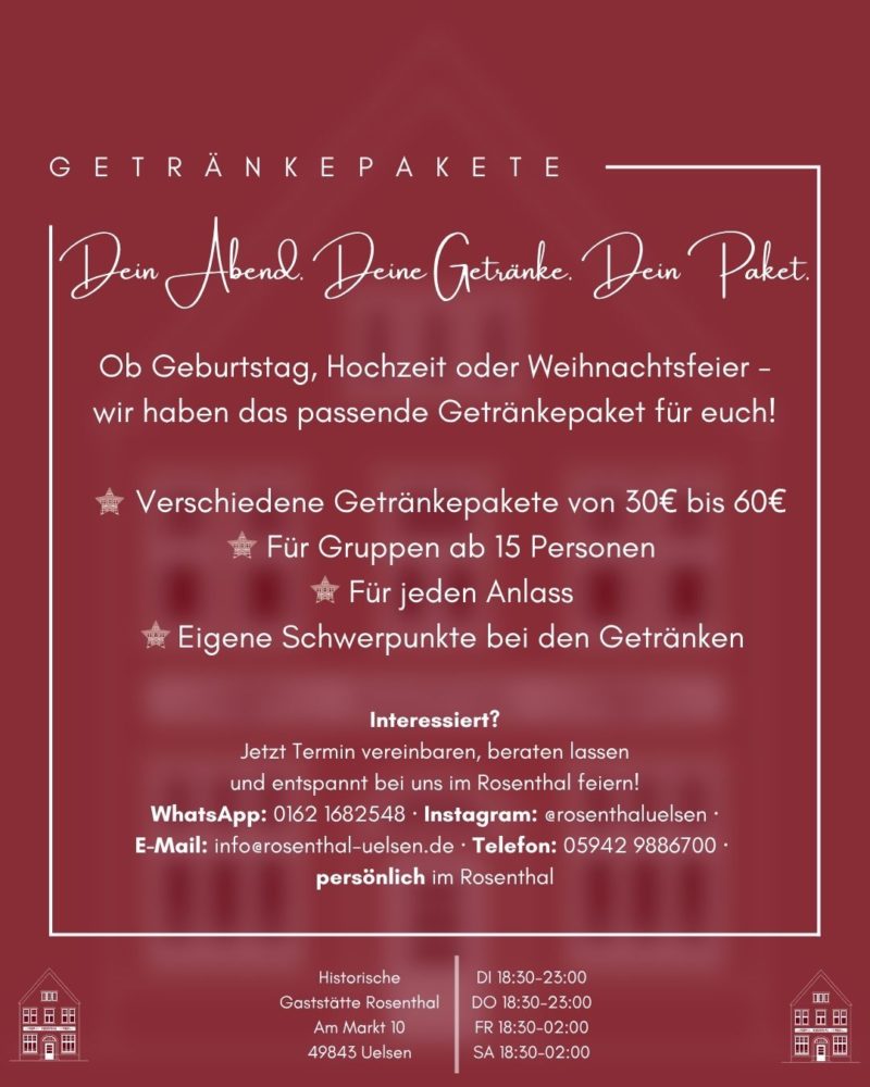 und suchst noch die richtige Räumlichkeit? Komm zu uns ins Rosenthal und schau dir gerne unser separates Gesellschaftszimmer im Obergeschoss an. Bis zu 35 Personen finden hier Platz und ihr seid ungestört von anderen Gästen im Erdgeschoss. Unser Gesellschaftszimmer verfügt über eine eigene Theke, einen extra Raum für euer Buffet und über eigene sanitäre Anlagen.